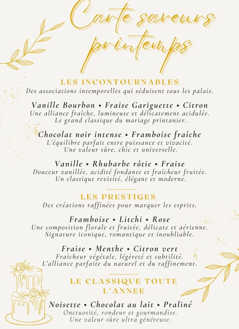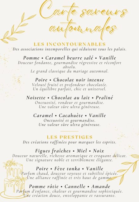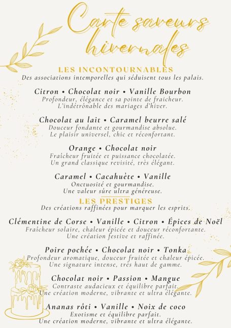 Vous trouverez ici les cartes saisonnières faites pour vous donner des idées de ce qui plaît et fonctionne très bien. Néanmoins il est toujours possible de composer autrement en fonction de vos goûts et envies.